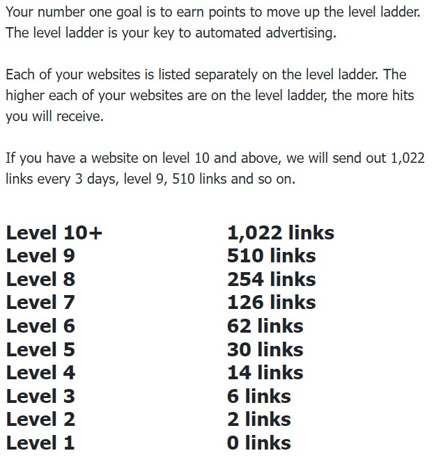 The system uses what’s called the level ladder. The ladder starts at 0 and goes up to the highest level of 17. The idea is quite simple. As you acquire points you move up the ladder. When you reach level 10 you will have 1,022 emails sent out every three days containing your affiliate links. As you can see this is a great surge in free advertising. The higher you are on the ladder the more daily emails containing your links are sent out. The emails are only sent out to active members as they are more likely to be clicked.